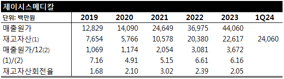 제이시스메디칼 역시 미용의료기기를 판매하는 경쟁사이다. 원텍은 평균적으로 7~8달치 재고를 쌓아두고 제이시스메디칼은 6~7달치 재고를 쌓아두는 것으로 보인다. 이는 재고 관련 회사 내규나 영업 방식이 달라 생길 수 있는 차이이기에 문제가 아니다. 그러나 원텍의 2023년 재고는 거의 1년치로 크게 증가하였다. 이는 분명히 정상적인 상황이 아니다. 미용의료기기 기업이 전체적으로 재고를 많이 쌓아두는 편이라고 하더라도 추세적으로 크게 이탈했다면 상황을 의심해봐야 한다.