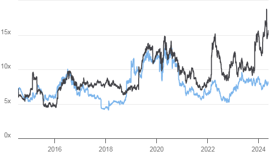 그러나 두 기업을 비교해보면 차이가 있다. 매출액 기준으로 회전율을 보면 차이가 별로 없어보이지만 생산량 기준으로 보면 25~30% 정도 차이가 존재한다. 금을 제련해서 파는 지에 따라 P는 변화하기에 매출액은 왜곡될 수 있다. 하지만 채굴하는 양은 같은 기준으로 산정된다. 즉, Newmont가 Barrick Gold보다 더 효율적인 광산을 가지고 효율적으로 금을 채굴한다고 볼 수 있는 것이다. 이는 2배 가까이 차이나는 양사의 EV/EBITDA로 드러난다.(물론 다른 요인도 많을 것이다.)