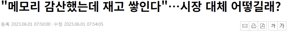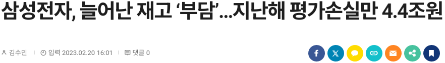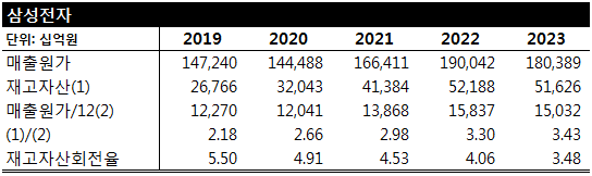 삼성전자를 예시로 들어 계산해보면 항상 세 달치 미만의 재고를 가지고 있다가 2022년 뛰어넘더니 2023년에는 세 달치를 훌쩍 넘는 재고를 가지게 되었다.(재고자산회전율도 2019년 5.5에서 2023년 3.49까지 떨어졌지만 사실 직관적으로 와닿지는 않는다.) 그래서 뉴스에는 이런 얘기가 흘러나온 것이다.