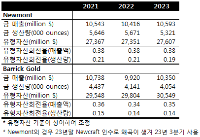 두 기업 모두 매출액 기준으로 보나, 생산량 기준으로 보나 시간이 흐름에 따라 차이를 보이지 않는다. 이는 BM을 보면 이해되는데, 이들은 광산에서 금, 구리 등을 캐내어 파는 기업이다. 광산 개발에만 십수년이 걸리기에 단기간에 생산량을 늘릴 수 없고, 한 광산에 매장되어있는 원자재 양은 한정적이고 채굴 기술은 장기간에 걸쳐 조금씩 발전하기에 단기간에는 회전율이 차이를 보이지 않는 것이다.